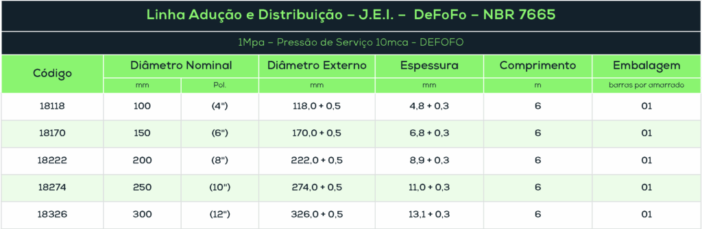 Produto desenvolvido para linhas de maior diâmetro dos sistemas de adução e distribuição, principalmente nas linhas-tronco. Disponíveis nas bitolas de DN 100 a 500 (118 a 532mm) para pressão de serviço de 1Mpa, conforme NBR 7665. Apresentam os mesmos diâmetros dos tubos metálicos, permitindo inclusive a intercambiabilidade entre as peças.