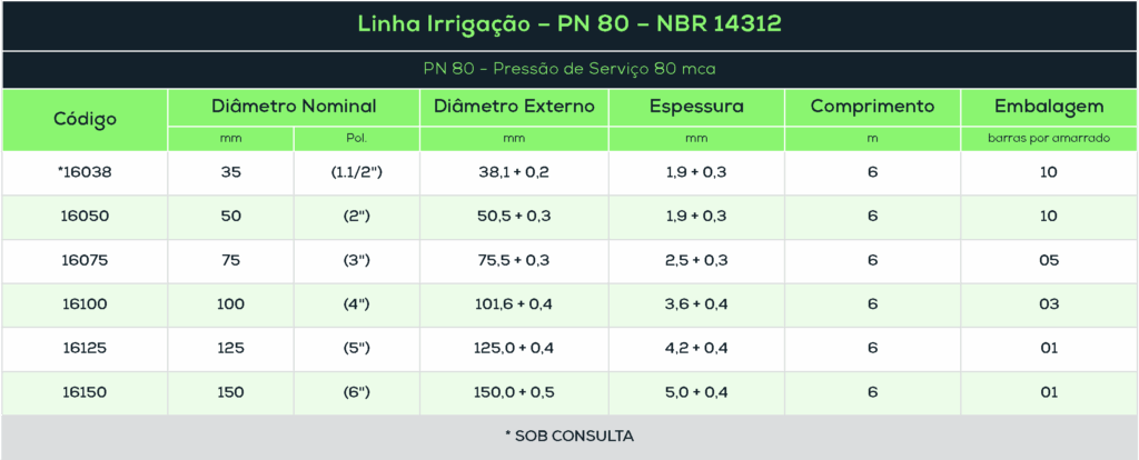 É fabricado de acordo com Norma ABNT NBR 14312, nas classes de pressão PN 40 – 4,0 Kgf/cm² e PN 80 – 8,0 Kgf/cm².