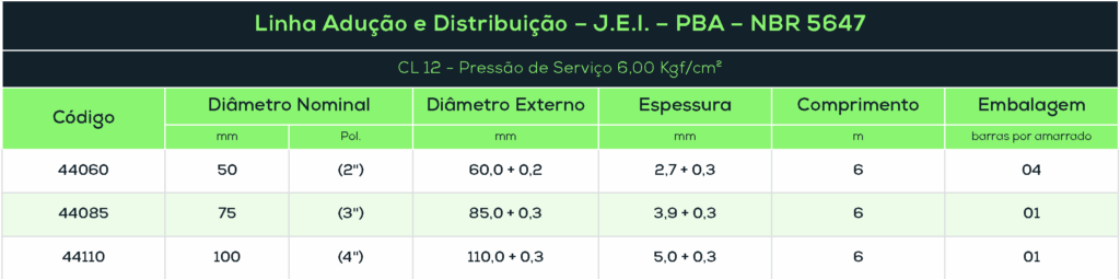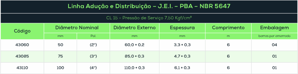 São fornecidos com a junta elástica incorporada (JEI), que possibilita velocidade na conexão com total garantia de estanqueidade, mesmo que haja movimentos no solo ou eventuais movimentações da própria tubulação.
