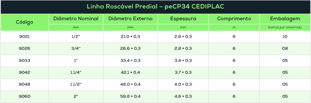 É fabricada na cor branca que caracteriza o produto, com junta roscável – BSP e em diâmetros indicados em polegadas que variam de 1/2″ até 2″.
